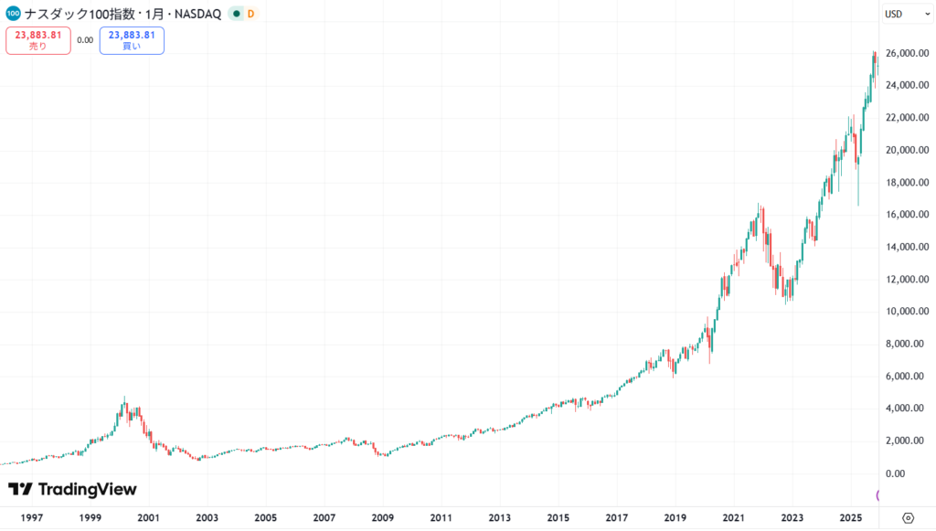 直近30年でNASDAQ100は年率約13.4%と非常に高いリターンを出しています。