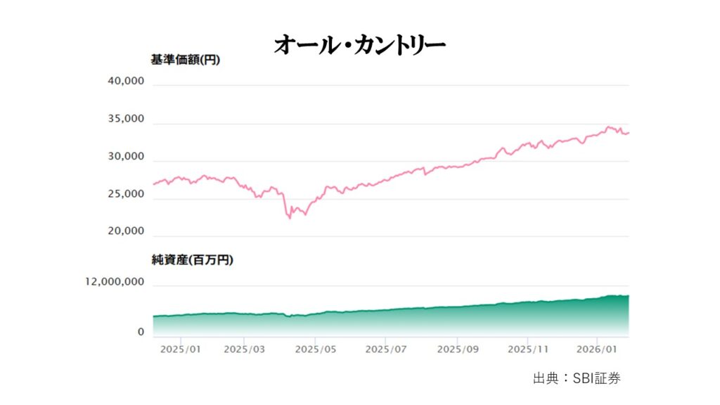 eMAXIS Slim 全世界株式(オール・カントリー)は、年初の基準価格27,473円、年末の基準価格33,365円。